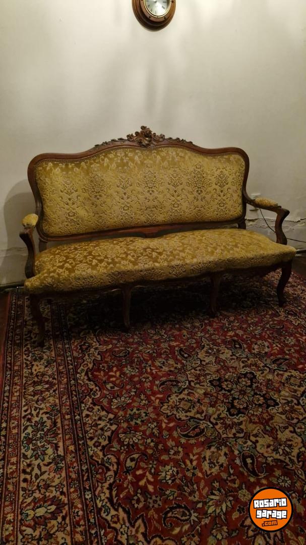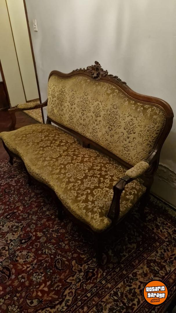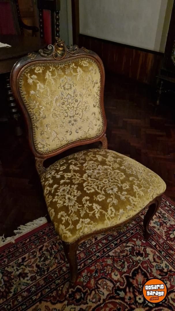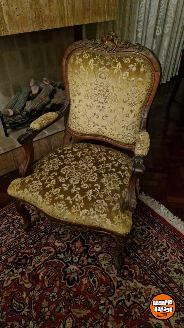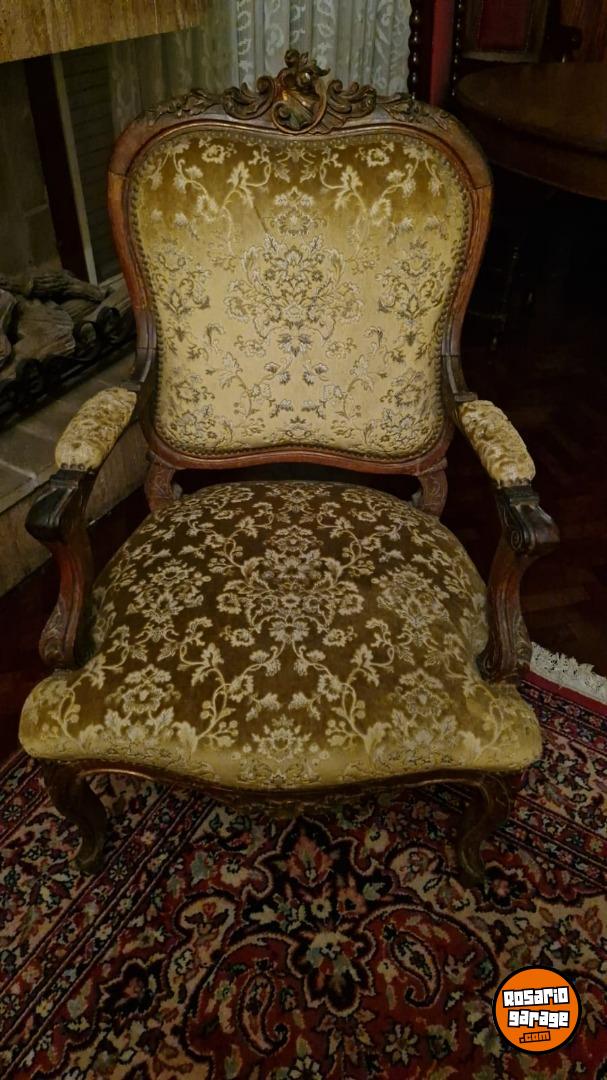 Hermoso juego de sillones centenarios estilo Luis XV compuesto de: 1 sillón de 3 cuerpos, 2 sillones de 1 cuerpo y 4 sillas. Tapizados en pana.