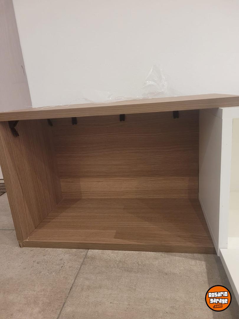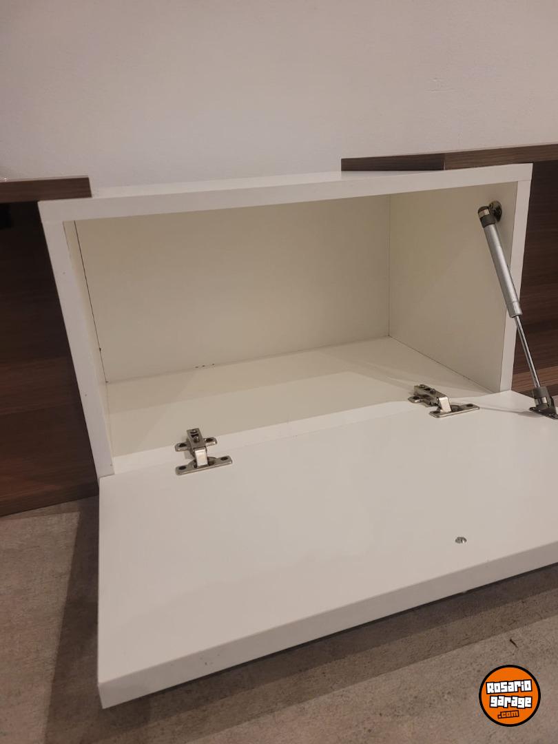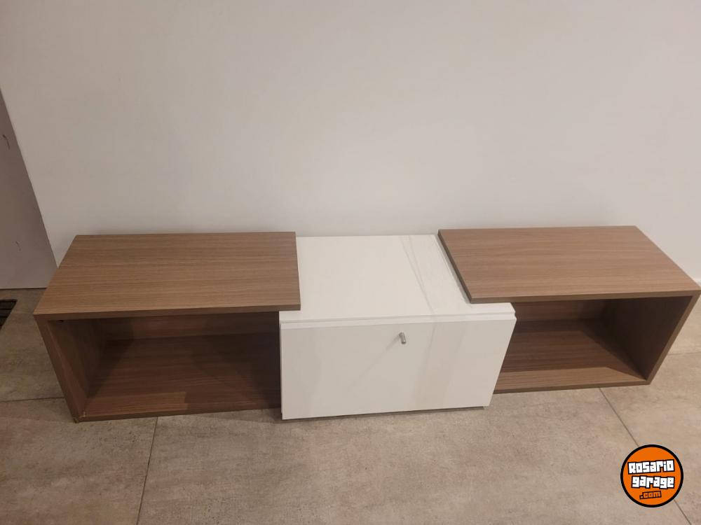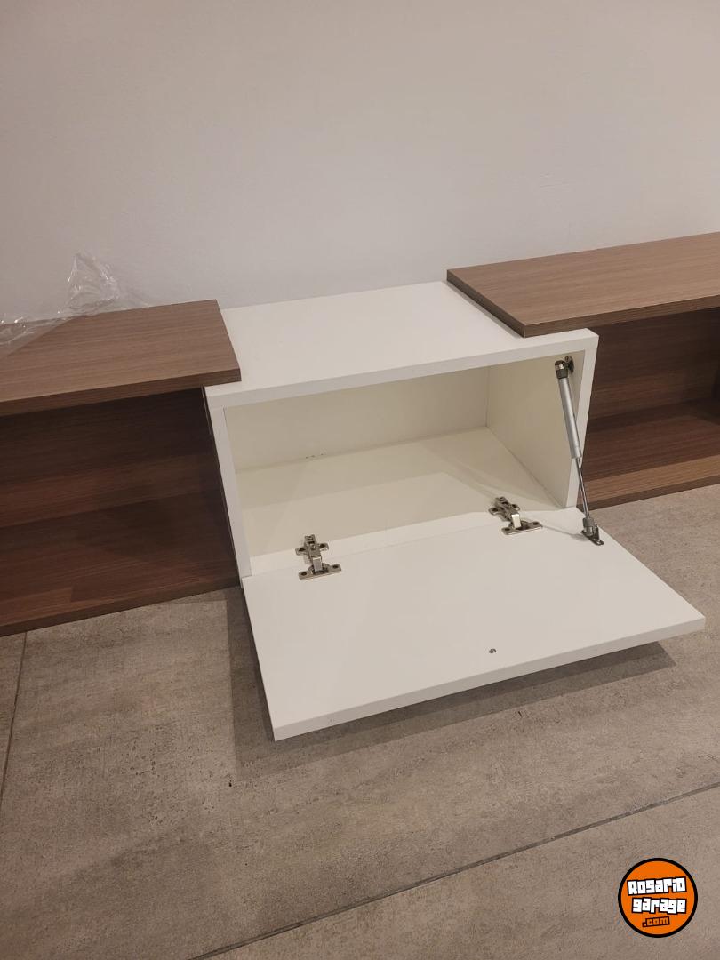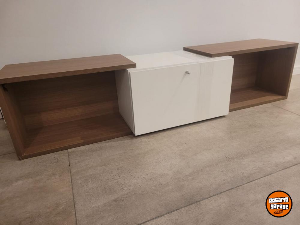 Rack de Tv flotante con dos estantes y una puerta. Color madera y blanco. Medidas 155 cm (ancho) x 35 cm (profundidad) x 36 cm (alto). Nuevo, sin uso.