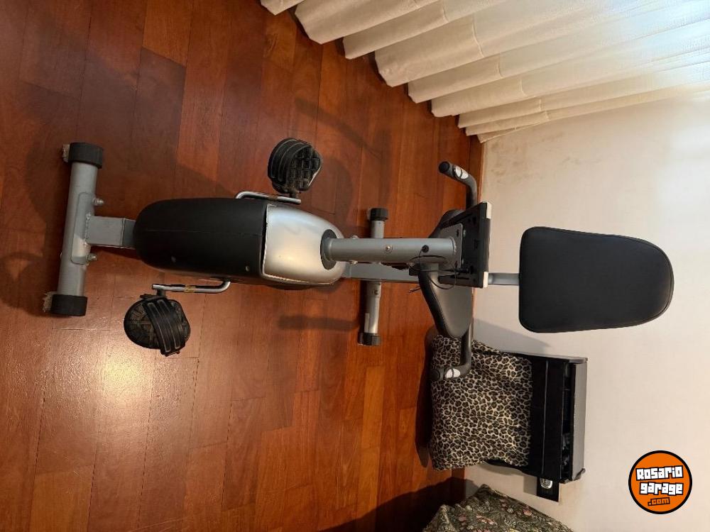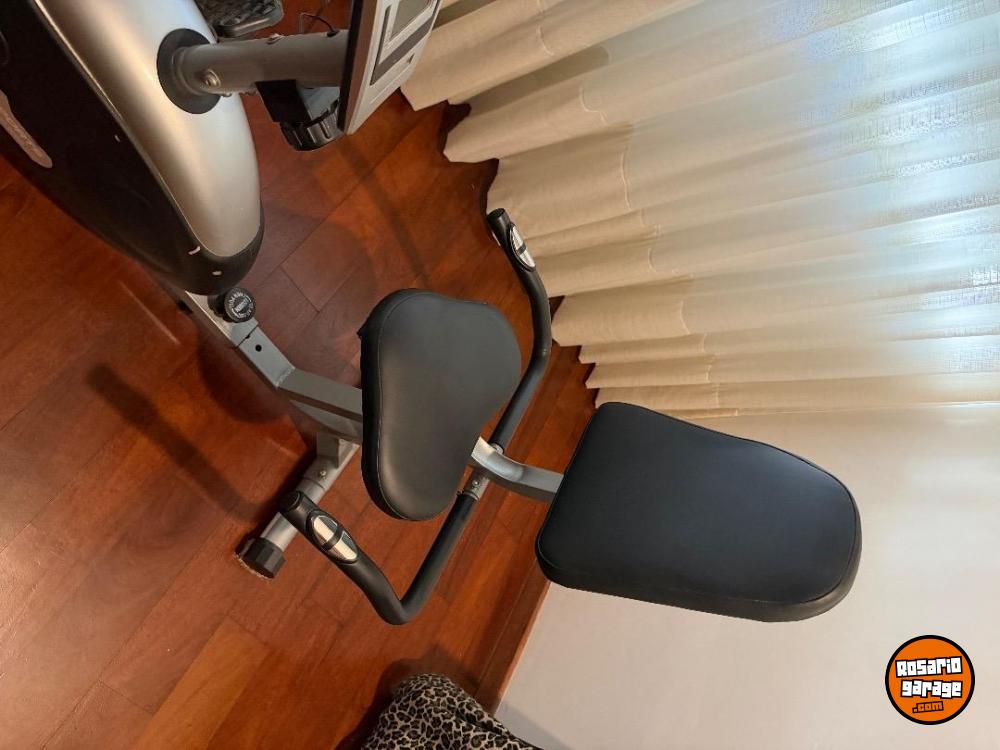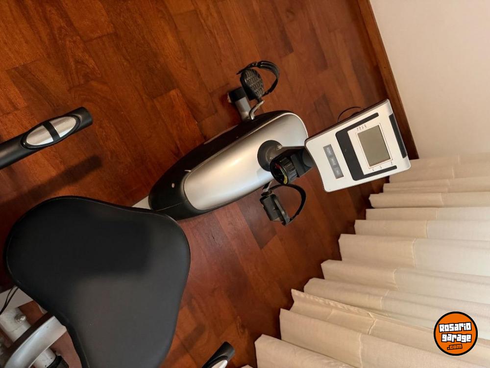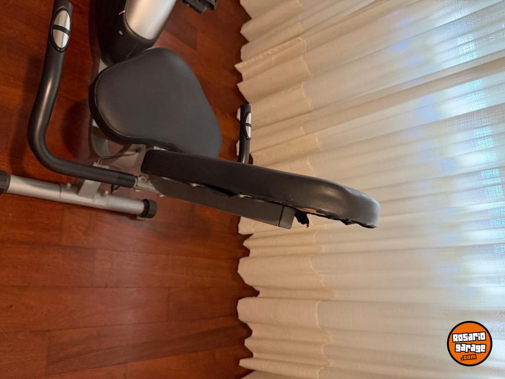 Es una bicicleta fija con respaldo, en perfecto estado.