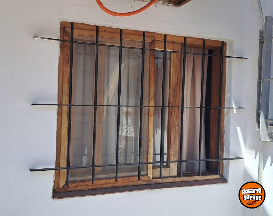 Ventana corrediza de cedro, con mosquitero y reja de hierro.