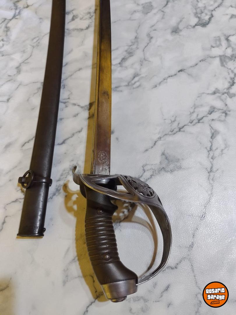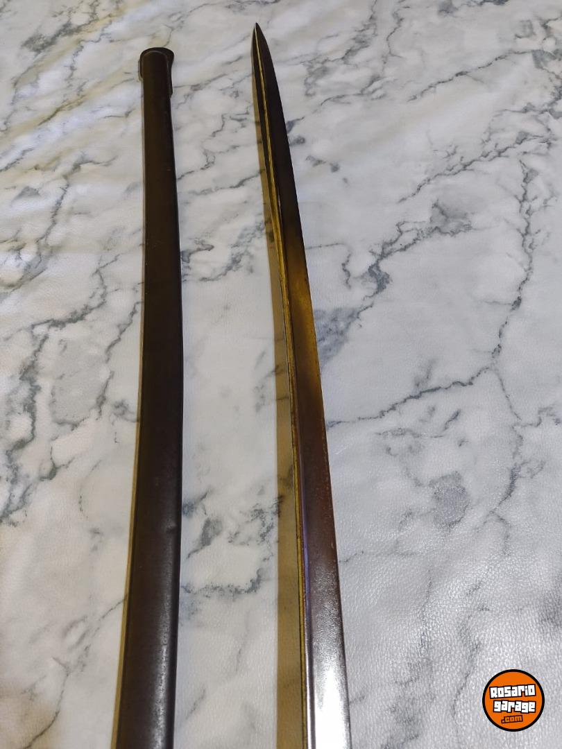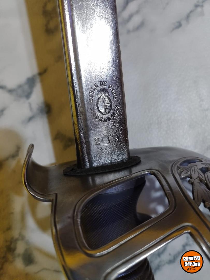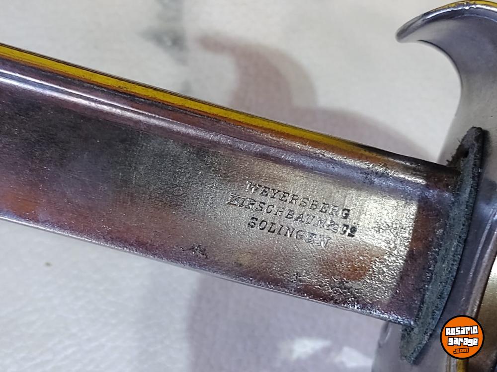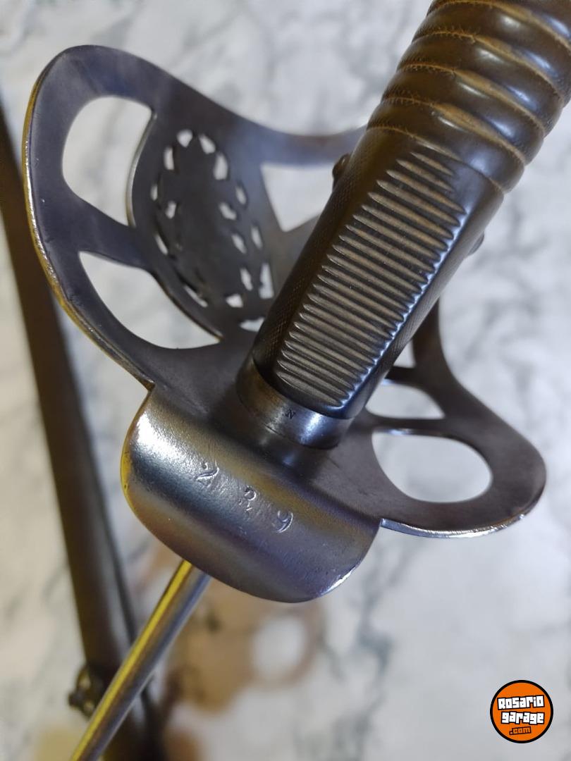 Antiguo Sable de Caballería Modelo 1898 Bajo Número en muy buen estado. No coincide su Numeración de Vaina. Número 239. De las primeras tandas ingresadas al país desde Alemania por su baja Numeración. Hoja de Acero al Carbono, grabada con sus sellos de fabricación Weyesberg Kirschbaum Co Solingen de un lado y con la leyenda Sable de Caballería Modelo 1898 del otro lado. Vaina con su empavonado original en buen estado, sin golpes. Empuñadura de Baquelita Ranurada intacta. Cazoleta de Acero, grabado con la figura del Escudo Nacional en bajo relieve.