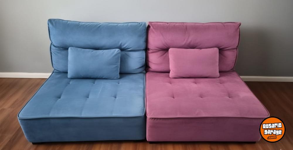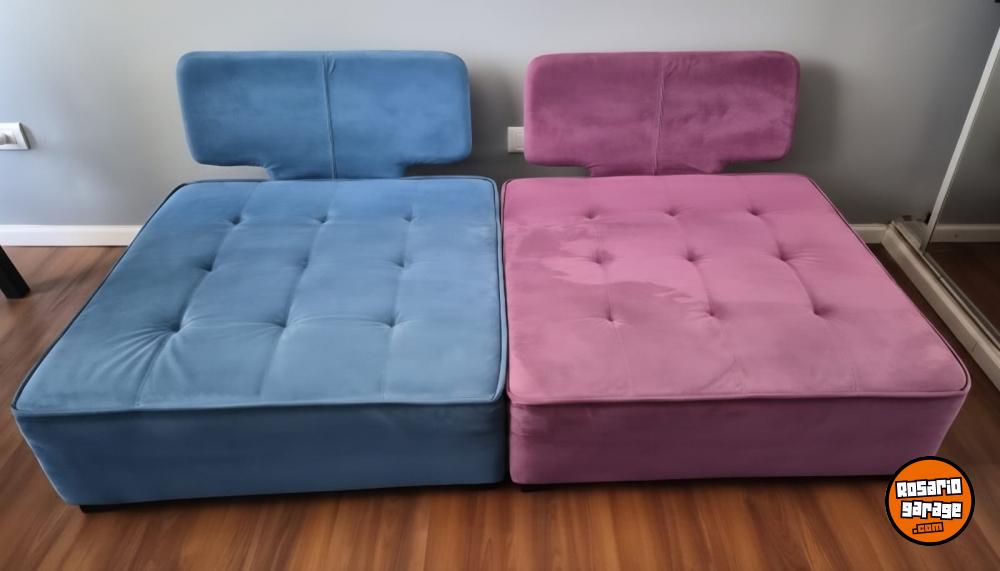 Dos Sillones, rosado y celeste, de terciopelo en excelente estado. Almohadón grande para la espalda es removible, y viene con su respectiva almohada chica de la misma tela.