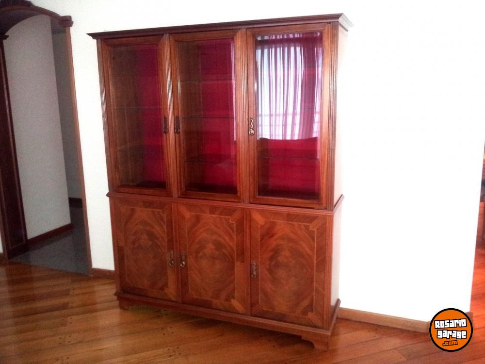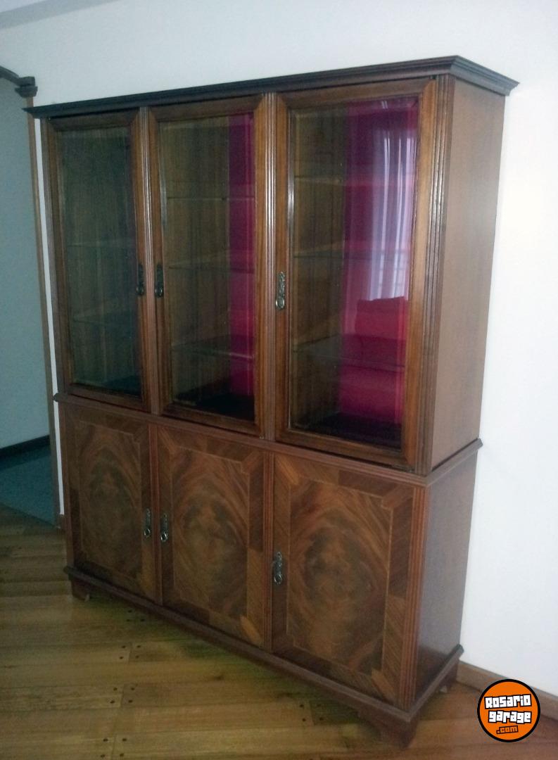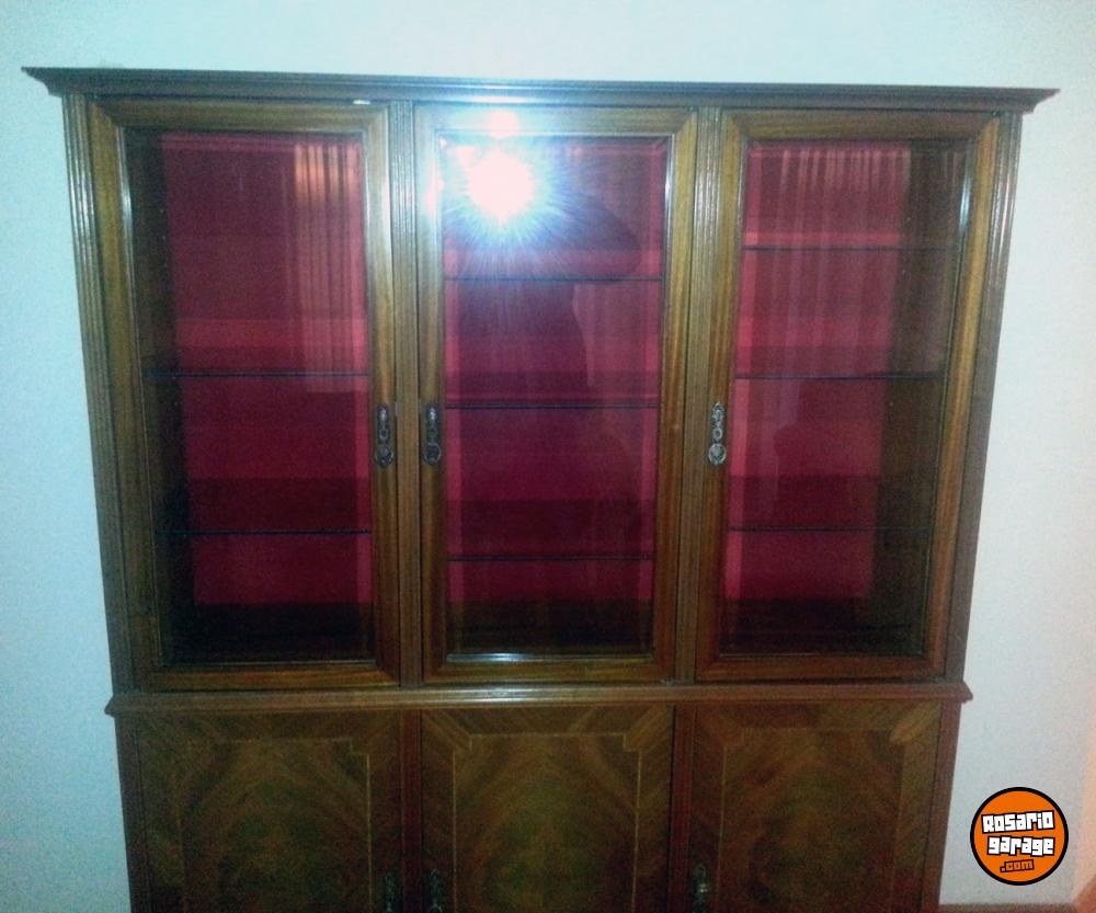Hermoso cristalero de cedro con puertas enchapadas en pluma de caoba, interior en pana roja con iluminación, estado impecable
