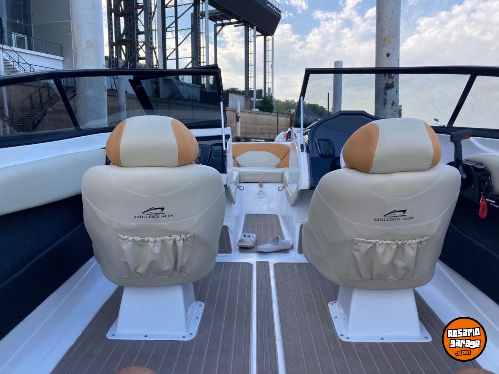 Incluye parabrisas curvo, piso matrizado, tapicería completa, sillón en popa para 4 personas, 2 butacas deportivas giratorias, 3 asientos en proa, tablero de 4 teclas, toma 12 volts, volante deportivo, caja de dirección, guantera con cerradura con llave, toma 12 volt dentro de la guantera, luz de interior, 6 posavasos de acero inoxidable, planchadas de popa con escalera rebatible, tanque interno de combustible de 50 Lts con tapa exterior y venteo, luces reglamentarias, bomba de achique de 500 gph, 3 cancamos de acero inoxidable y 5 cornamusas.