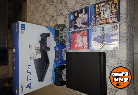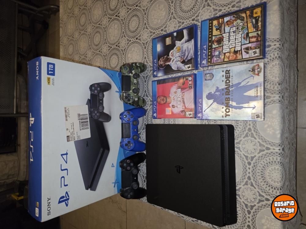 Vendo playstation 4 slim de 1tb en perfectas condiciones, con caja, cables, 3 joysticks y 4 juegos