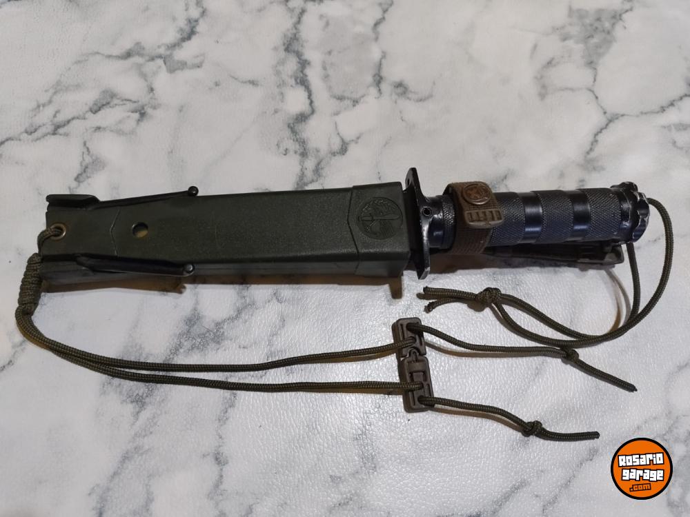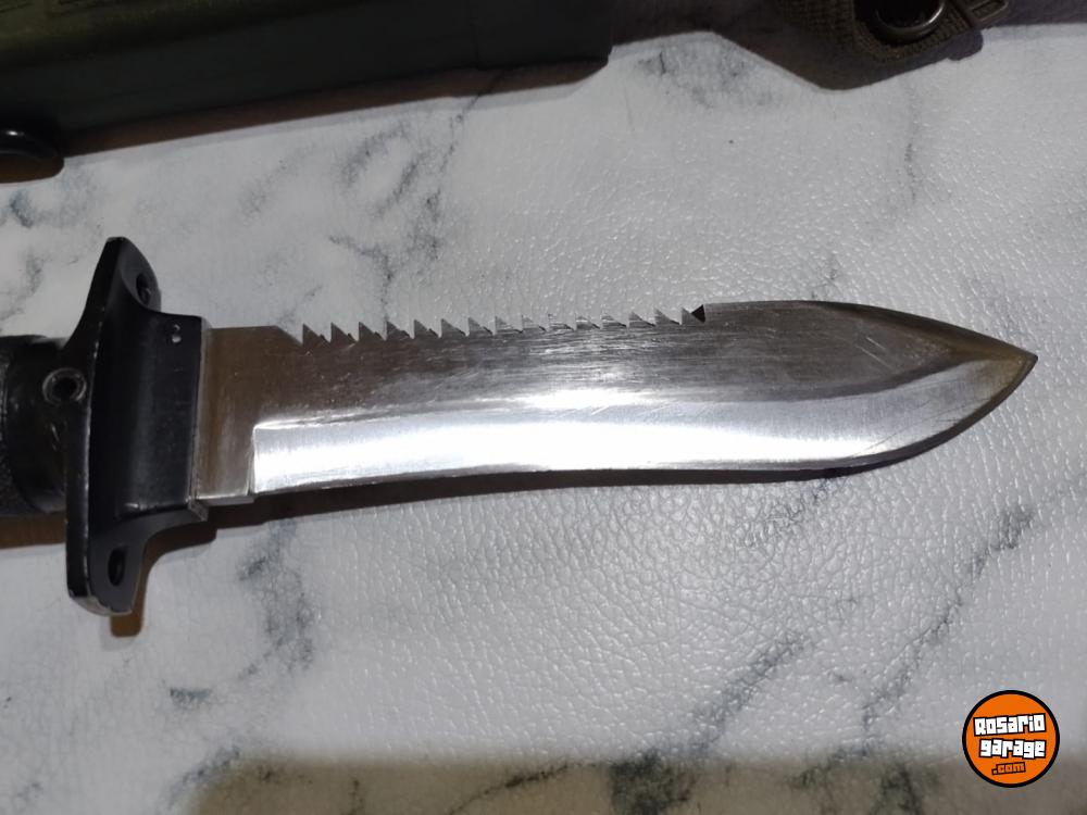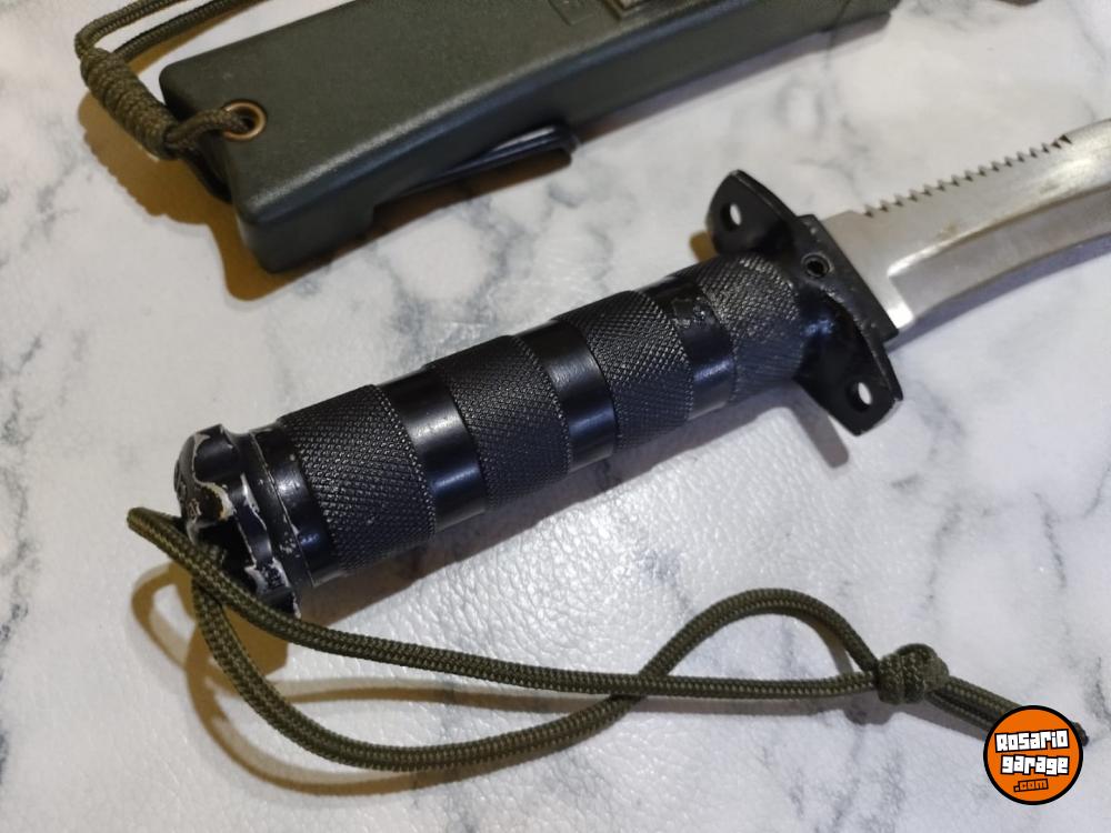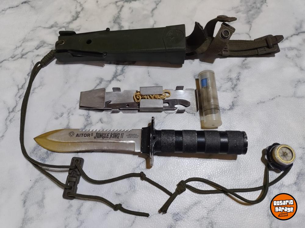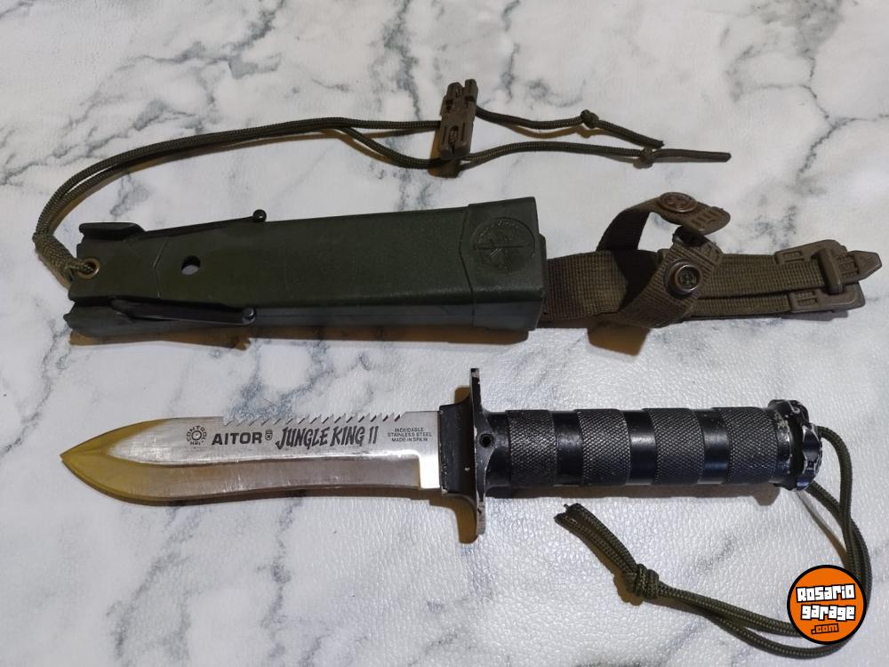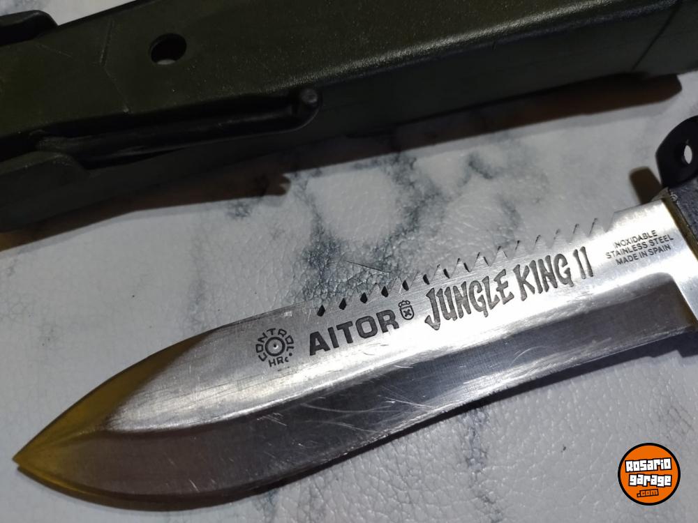 Cuchillo español Aitor modelo Jungle King II fabricado a principio de los años 80. Esta versión tiene diferencias al modelo final que se comercializó en aquellos años, diferencias en el cuchillo y en sus accesorios. La sierra de la hoja es con los dientes más agudos y orientados hacia el pomo del cuchillo. En el pomo tiene grabado "Aitor Jungla 463" referencia del cuchillo en la marca. La brújula es diferente como podrá observar en las fotos. En los accesorios esta versión incluía un arpón multiusos en vez del cuchillo multiusos skinner de la versión posterior, también el cajetín interior de la vaina es metálico y tiene el espejo de señales integrado pulido a diferencia del posterior que ya era de plástico y el espejo era pegado. Una versión que cualquier coleccionista de la marca Aitor debería de tener
