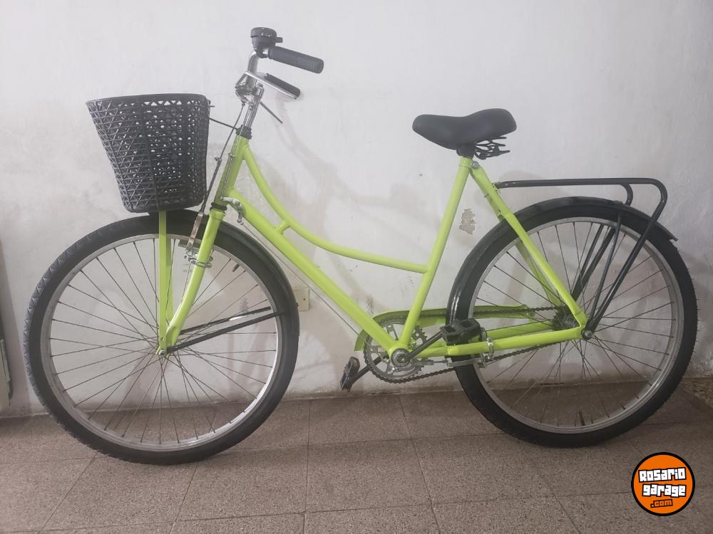 BICICLETA RODADO 26, TIPO INGLESA O BALONA COMPLETA, PINTURA NUEVA, ACCESORIOS NUEVOS: ASIENTO, CUBIERTA TRASERA, PUÑOS, PEDALES, SISTEMA DE FRENOS Y VARILLAS, CUBRECADENAS, PORTAEQUIPAJE, CUBETAS DE PEDALES.