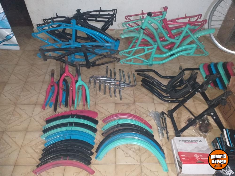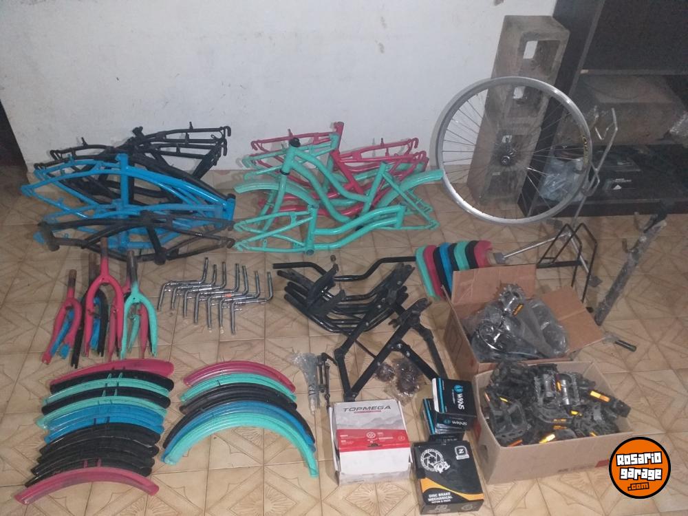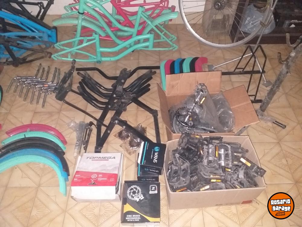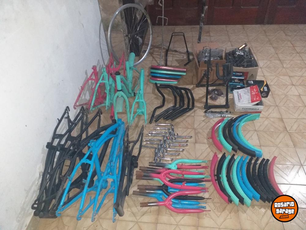 Algunas cosas: Cuadros de bicicletas niño/niña, Manubrios, Juegos de palancas, Horquillas, Cubrecadenas, Guardabarros, Rueda de bicicleta de carrera con cambios, Soportes de bicicleta, Centrador de bicicletas, Pedales, Frenos de disco y Repuestos varios.