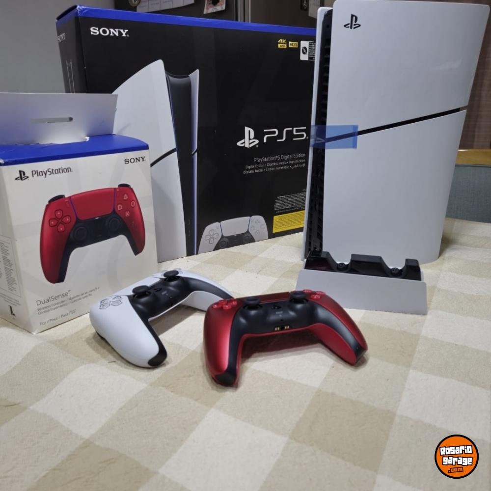VENDO PS5 slim digital 1TB. 2 joystick originales + base de carga. Muy poco uso, impecable estado. Para mas fotos o consultas 3413340256. Acepto tarjetas de crédito hasta 3 cuotas sin interés con todos los bancos o 6 cuotas con bancos seleccionados