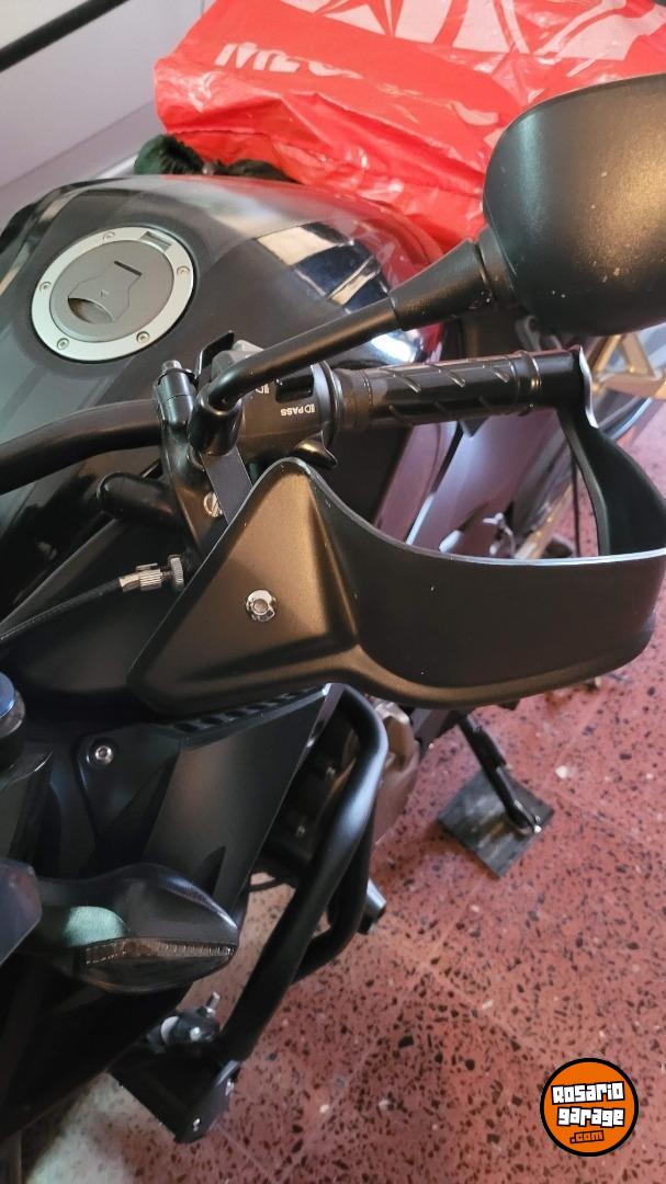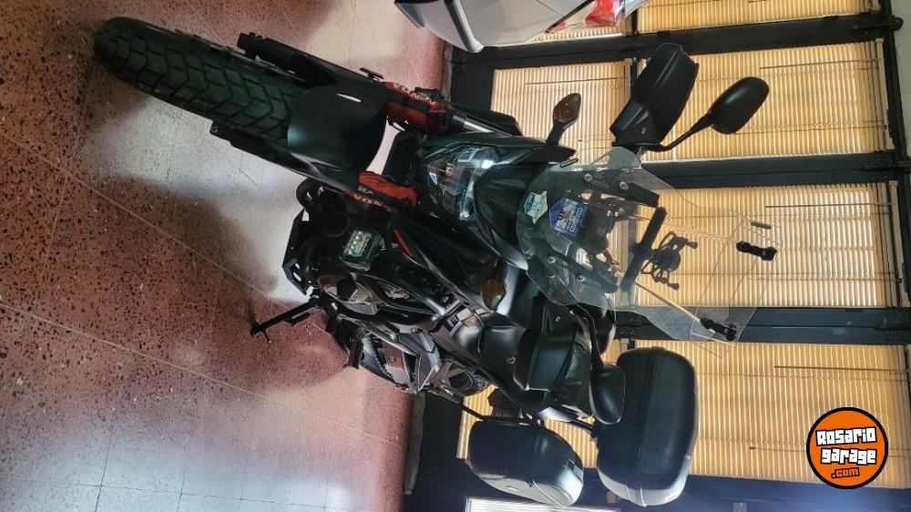 2- Con todo el equipamiento par viajes, cubiertas mixtas semi tacos parabrisas Pferd con deflector, barras protectores de motor con Sliders, baul top case grande reforzado, baules