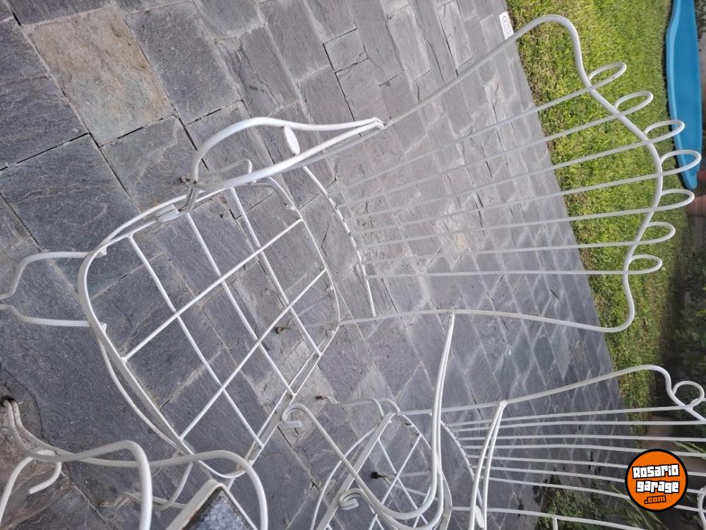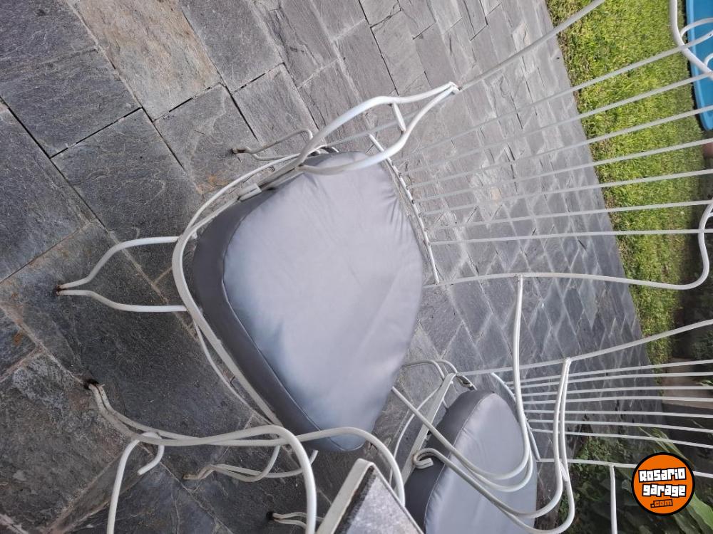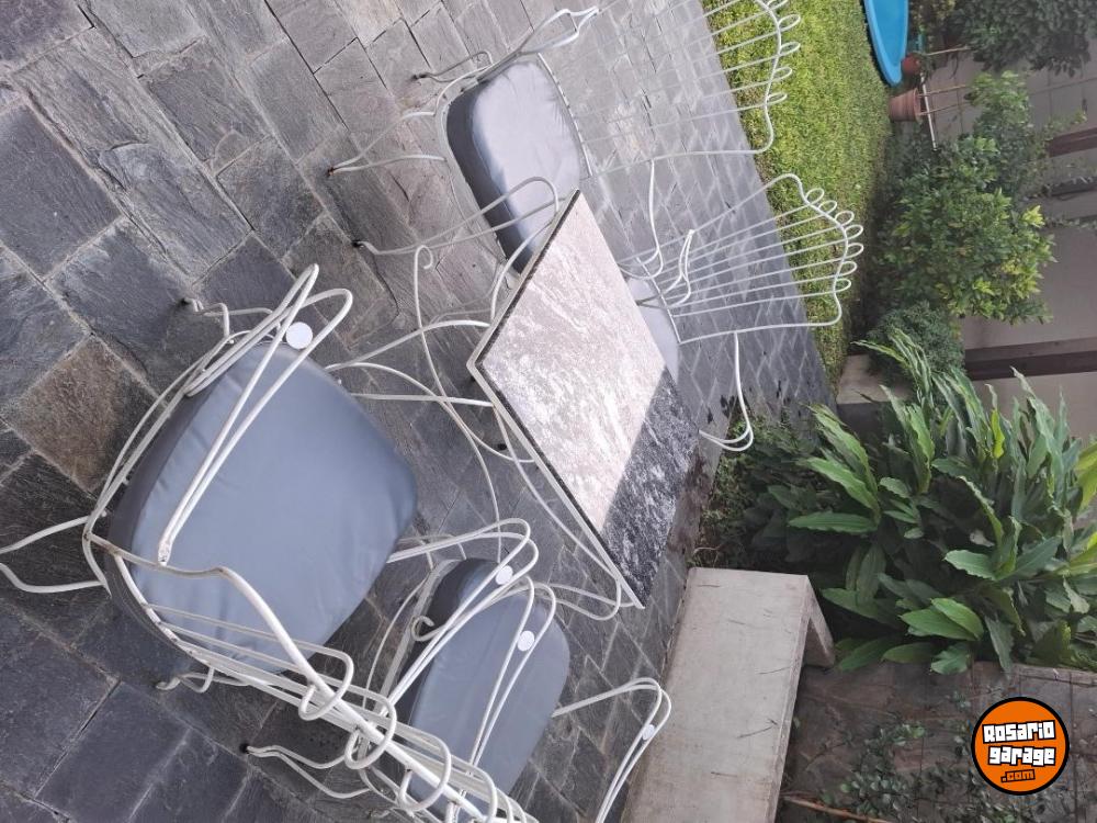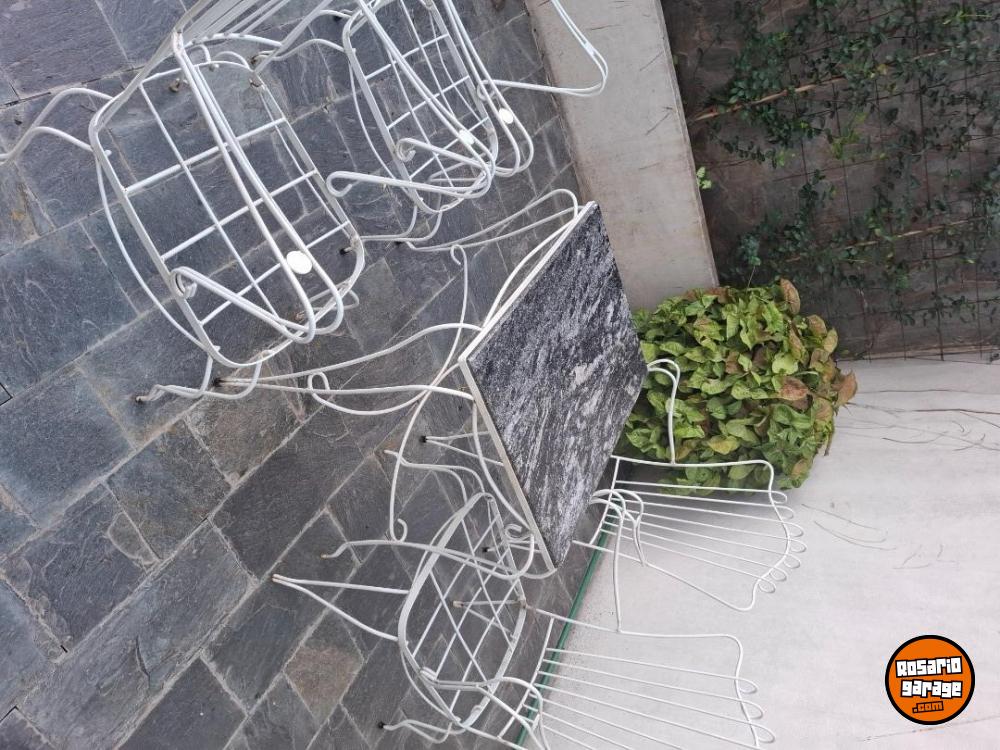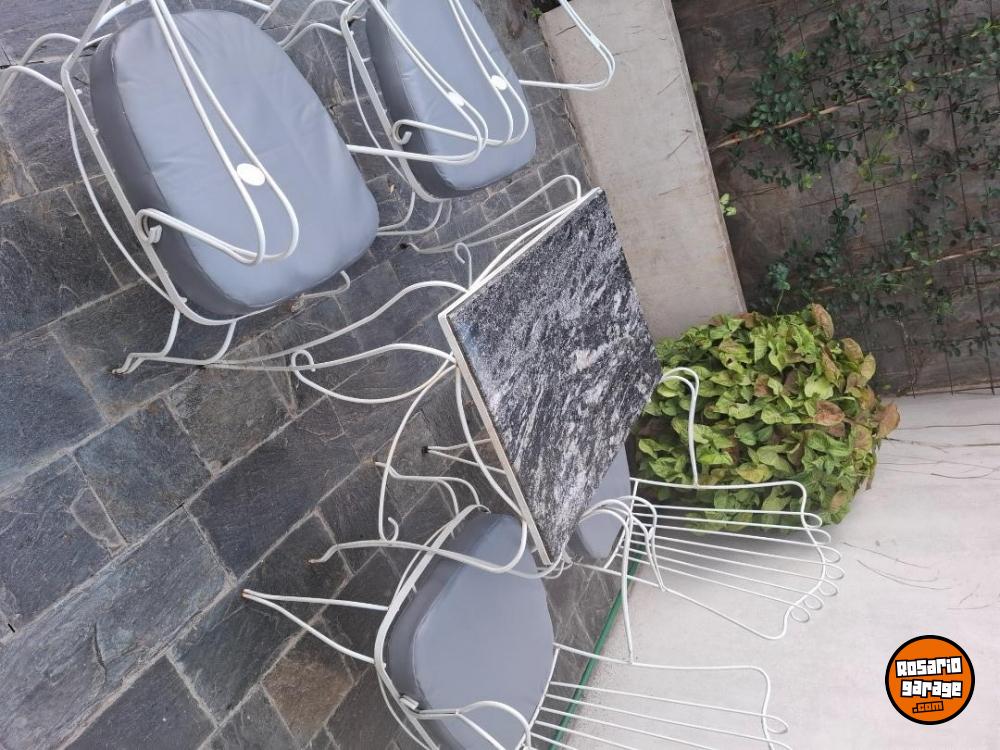 Juego de jardín antiguo de hierro, cuatro sillones con almohadones nuevos y mesa con mármol nuevo! Impecable!